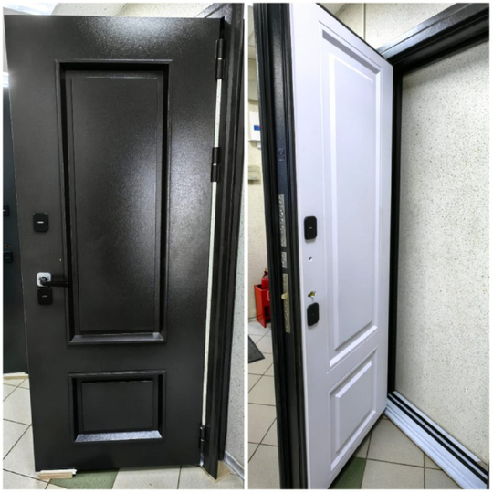 термо-профиль в полотне и коробе, закрытый короб, фигурный наличник, 3 контура уплотнения, порог из нержавейки, петли 3 шт. капли, эксцентрик, черная фурнитура, ночная задвижка, противосъемы 3 шт., утеплитель полотна (2 слоя минеральной плиты), утеплитель короба (минеральная плита)