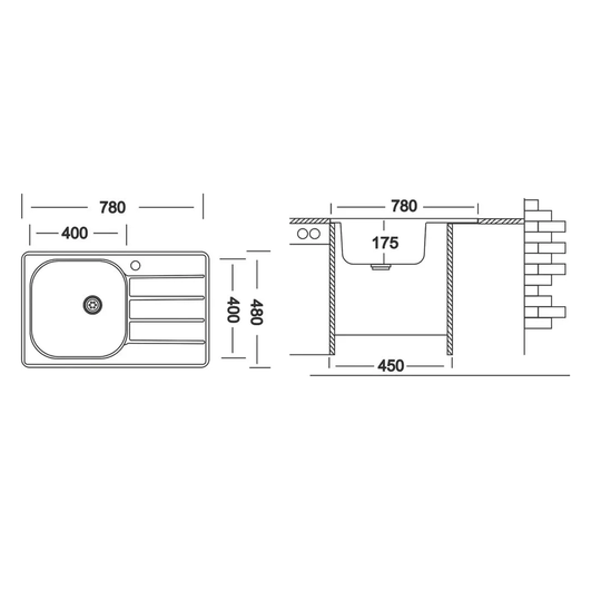 - Размеры мойки (Ш Д Г) 78x48x17,5 см;