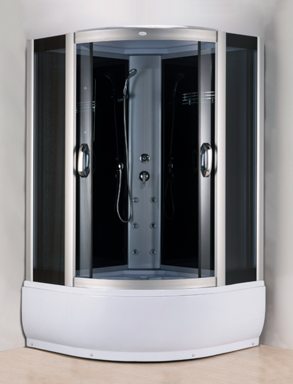 - Комплектация: верхний душ, 6 гидромассажных форсунок, ручной душ с держателем, стеклянная полка, зеркало.