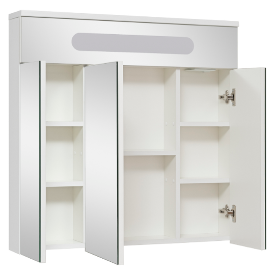 Зеркало-шкаф Olivia 80 оснащен тремя распашными зеркальными дверцами. Блок розетка/выключатель расположен внутри шкафа. Полки под хранение обеспечивают порядок внутри. Петли на дверцах со встроенным доводчиком.
