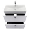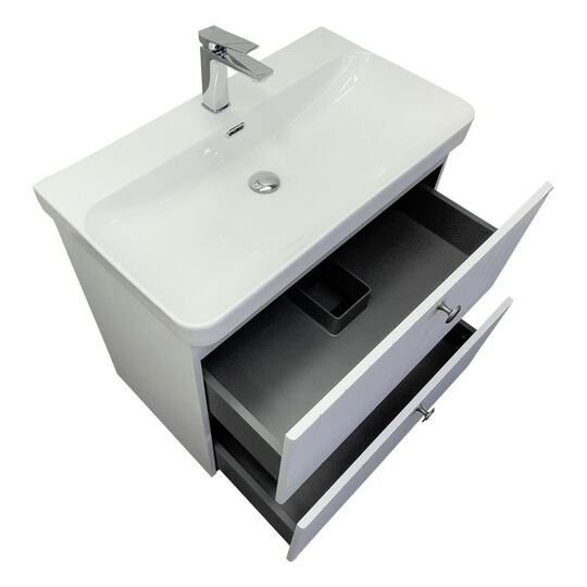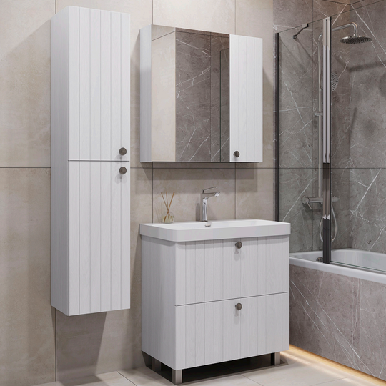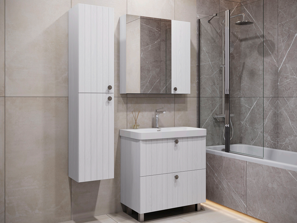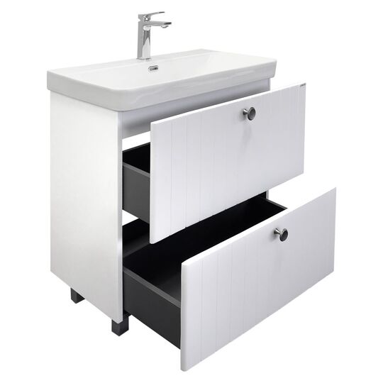 Напольная тумба Истра 80Н с двумя широкими выдвижными ящиками, оснащенными направляющими Hettich с системой плавного закрывания. Фасады тумбы изготовлены из МДФ, фрезерованы вертикальным узором и и облицованы пленкой имитирующей текстуру дерева ясень беленый. Внутренние детали из влагостойкого ЛДСП. Ручки из цинкового сплава в цвете состаренный черненый. Тумба подготовлена для подключения водоснабжения снизу и сзади.