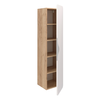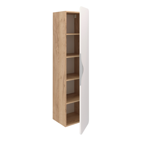 Пенал Skandi оснащен одной распашной дверцей (петли справа). Корпус выполнен из ЛДСП в древесной текстуре "дуб крафт золотой", а фасад - из МДФ в белой глянцевой эмали. Внутри пенала расположены 4 полки, которые создают достаточно места для хранения всевозможных гигиенических принадлежностей и бытовой химии. Дверца мягко и плавно закрывается благодаря петлям с доводчиком. Пенал выпускается только в правом исполнении. Лаконичным завершением общей композиции является стильная хромированная ручка.