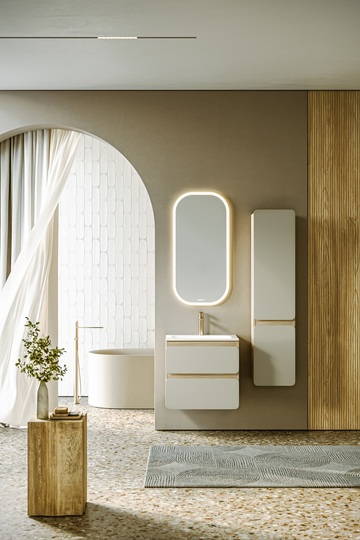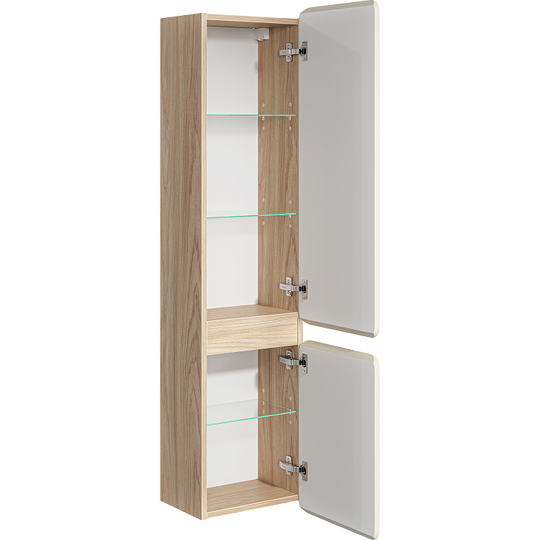 Созданная в стиле софт-минимализма, коллекция Vento отличается мягкой геометрией и визуальной тишиной. Скругленные фасады окрашены матовой краской, также они выполняют функцию скрытых ручек. Древесный корпус из ЛДСП в оттенке светлой акации. Пенал Aqwella Vento 35 оснащен двумя дверцами, комплектуется тремя стеклянными полочками.