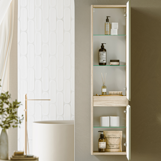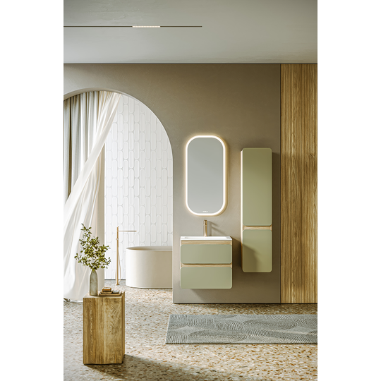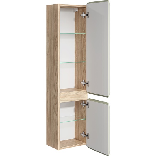 Созданная в стиле софт-минимализма, коллекция Vento отличается мягкой геометрией и визуальной тишиной. Скругленные фасады окрашены матовой краской, также они выполняют функцию скрытых ручек. Древесный корпус из ЛДСП в оттенке светлой акации. Пенал Aqwella Vento 35 оснащен двумя дверцами, комплектуется тремя стеклянными полочками.