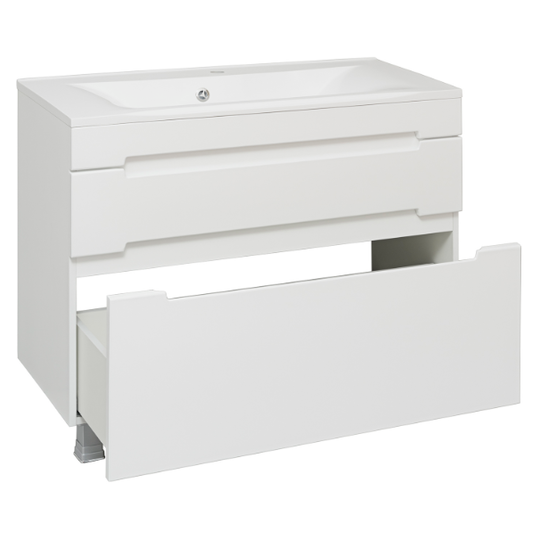 Тумба Olivia 100 оснащена двумя выдвижными ящиками на шариковых направляющих скрытого монтажа с доводчиками. Ящики легко открываются благодаря удобным вырезам на фасаде.