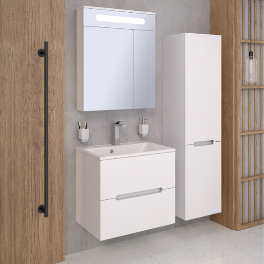 Тумба Olivia 65 оснащена двумя выдвижными ящиками на шариковых направляющих скрытого монтажа с доводчиками. Ящики легко открываются благодаря удобным вырезам на фасаде.