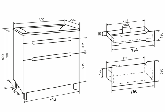 Тумба Olivia 80 оснащена двумя выдвижными ящиками на шариковых направляющих скрытого монтажа с доводчиками. Ящики легко открываются благодаря удобным вырезам на фасаде.