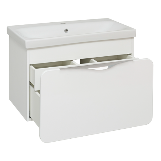 Тумба Skandi 80 оснащена двумя ящиками: внешним и внутренним. Внешний ящик на направляющих скрытого монтажа с доводчиком. Внутренний открывается с помощью механизма Push-to-Open. Корпус тумбы выполнен из ЛДСП, а фасад внешнего ящика - из МДФ. Лаконичным завершением общей композиции является стильная хромированная ручка.