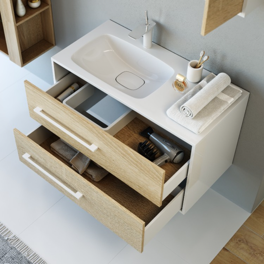 Подвесная тумба Aqwella Майами 90 оснащена двумя ящиками. Корпус тумбы из ЛДСП, окрашенного белой глянцевой эмалью. При изготовлении фасадов применяется технология нанесения кромки на ЛДСП с помощью лазера, что обеспечивает высокую влагостойкость мебели. Направляющие ящиков с функцией плавного и мягкого закрывания. Левая/правая ориентация.