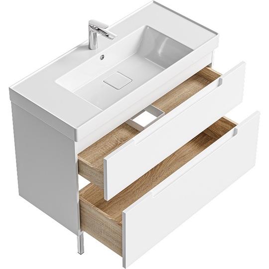 Тумба Ванкувер 101 на металлических ножках оснащена двумя ящиками с механизмами мягкого закрывания и тщательно организованным внутренним пространством с отделкой под дерево. Лаконичные фасады крашеные в белый цвет с интегрированной ручкой-зацепом подчеркивают чистоту форм и делают использование особенно удобным. Мебельный умывальник с декоративной вкладкой подчеркивает современный характер коллекции, а оптимальная глубина чаши обеспечивает комфортное ежедневное использование.