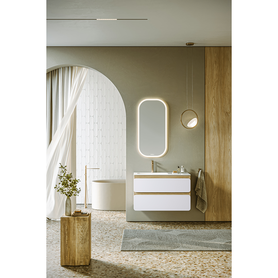 Созданная в стиле софт-минимализма, коллекция Vento отличается мягкой геометрией и визуальной тишиной. Скругленные фасады окрашены матовой краской, также они выполняют функцию скрытых ручек. Древесный корпус из ЛДСП в оттенке светлой акации. Тумбы Vento оснащены умывальниками Malaga из литьевого мрамора, сочетающими четкую геометрию с мягкой пластикой линий. Глубокая практичная чаша обеспечивает комфортность в использовании, а декоративная заглушка в сливной зоне сохраняет чистоту поверхности и архитектурную строгость. Версия тумбы 90 см с асимметричным умывальником, смещенным влево, благодаря чему все необходимое под рукой. Внутреннее пространство тумбы продумано до мелочей: дно ящиков выполнено в цвет корпуса, а в верхний ящик установлена система организации внутреннего пространства в виде трех перегородок из ЛДСП.