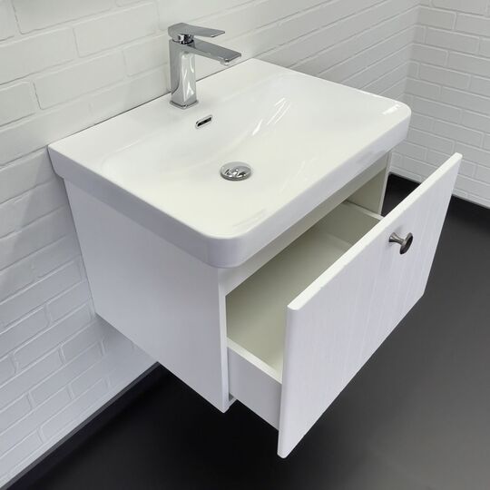 Подвесная тумба с одним широким выдвижным ящиком, оснащенным направляющими Hettich с системой плавного закрывания. Фасад тумбы изготовлен из МДФ, фрезерован вертикальным узором и и облицован пленкой имитирующей текстуру дерева ясень беленый. Внутренние детали из влагостойкого ЛДСП. Ручка из цинкового сплава в цвете состаренный черненый. Тумба подготовлена для подключения водоснабжения снизу и сзади.
