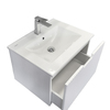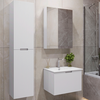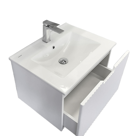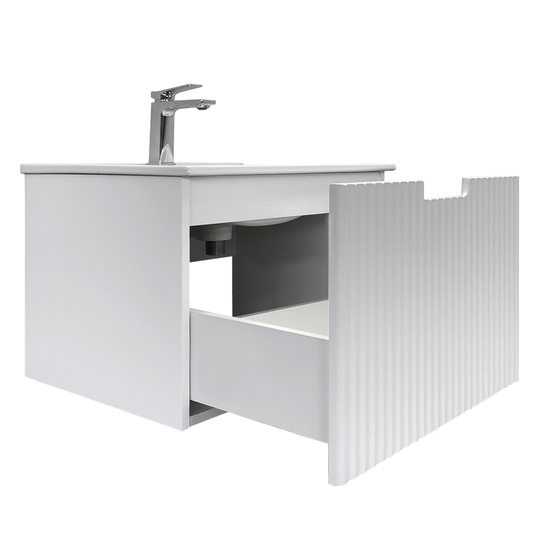 Подвесная тумба с одним широким выдвижным ящиком оснащенным направляющими с системой плавного закрывания. Фасад тумбы изготовлен из МДФ, фрезерован вертикальным узором и окрашен белой матовой эмалью. Тумба подготовлена для подключения водоснабжения снизу и сзади.