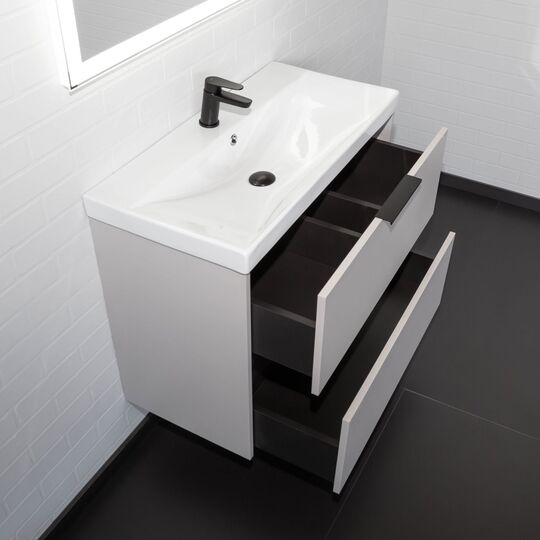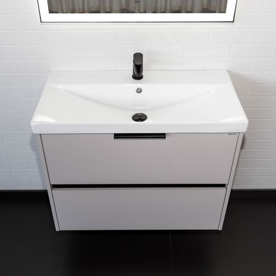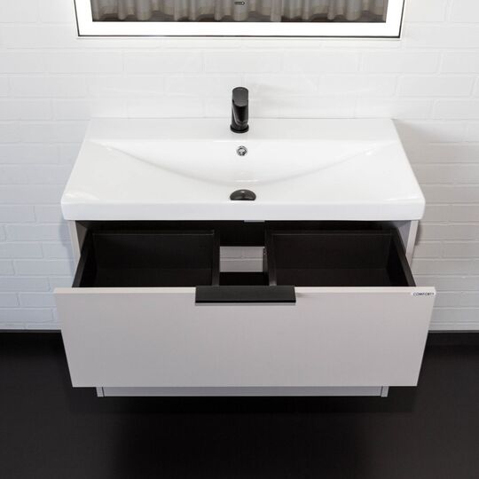 Подвесная тумба Comforty Селенга 80 с двумя вместительными выдвижными ящиками. Направляющие ящиков оборудованы системой плавного закрывания. Верхний ящик открывается черной профильной ручкой. Ручку устанавливать необязательно. Верхний ящик можно открыть за нижний край фасада. Для открытия нижнего ящика нужно потянуть верхний край фасада. Ящики выполнены из ВЛДСП контрастного черного цвета. Тумба подготовлена для подключению коммуникаций снизу и сзади.