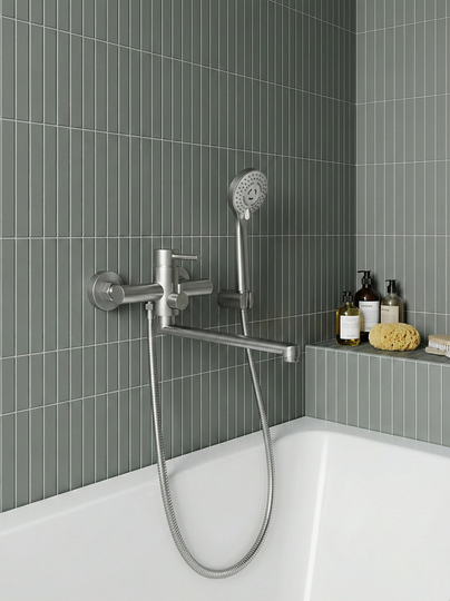 смеситель, лейка (АБС пластик), металлический шланг в двойной оплетке, настенный держатель, комплект эксцентриков, монтажный комплект